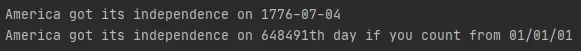 Finally, we print a message indicating the ordinal representation of America’s independence, formatted to include the toordinal value.