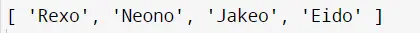 Als Ergebnis erhalten wir dieselbe Ausgabe wie im vorherigen Beispiel wie [ 'Rexo', 'Neono', 'Jakeo', 'Eido' ].