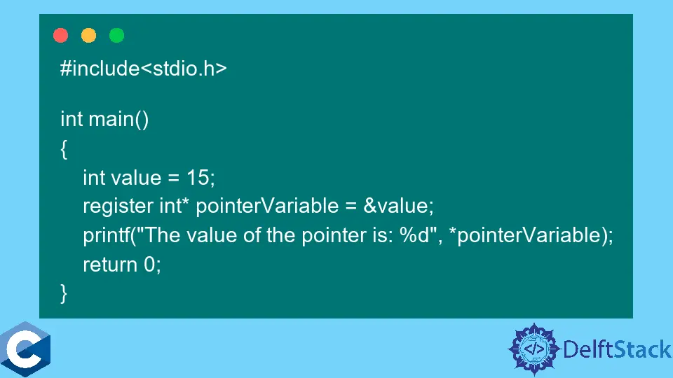Aquí hay un ejemplo de la palabra clave register utilizada con la variable de puntero en el lenguaje de programación C.