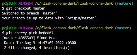 Podemos ejecutar el comando git cherry-pick, como se ilustra a continuación.