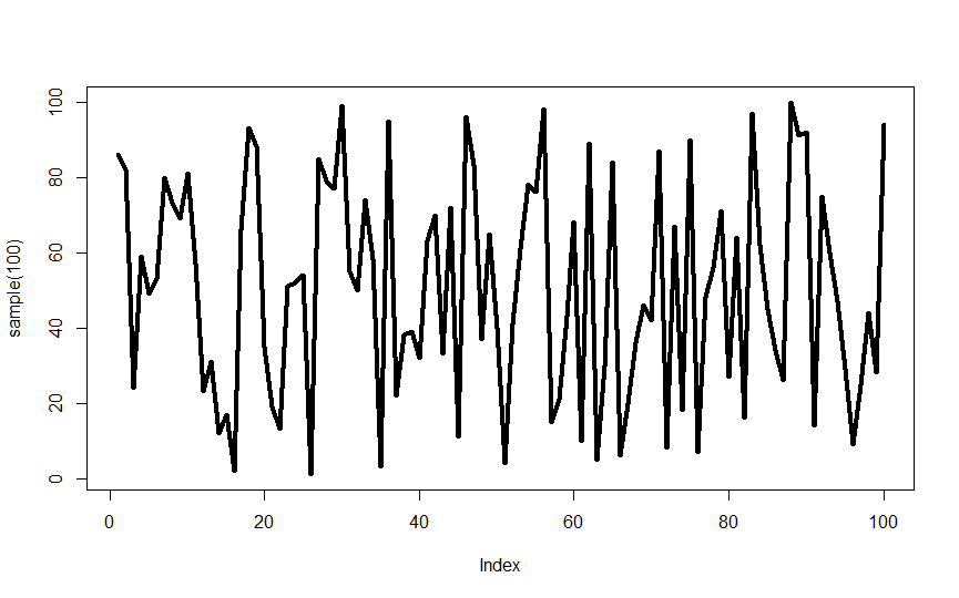 Podemos usar el parámetro lwd para establecer el grosor de las líneas de la trama. Por ejemplo, primero, trazaremos un simple gráfico de líneas usando la función plot(). La función sample() aquí crea una distribución aleatoria de 100 elementos:
