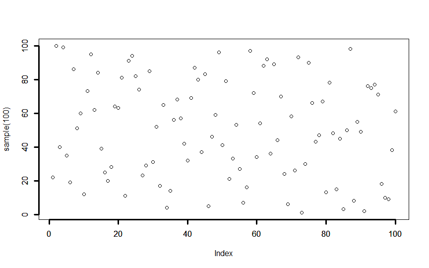 Primero, comenzaremos con un simple gráfico de dispersión de una distribución aleatoria de 100 elementos creados con la función sample(). Usaremos la función plot() para trazar esta distribución.