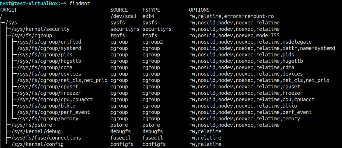 findmntpour obtenir la liste des systèmes de fichiers montés sous Linux -