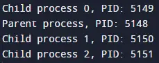 Each successful fork operation increments the num_children counter. In the child process block, denoted by pid == 0, the child process prints a message displaying its index and process ID (PID) before performing simulated work and returning.