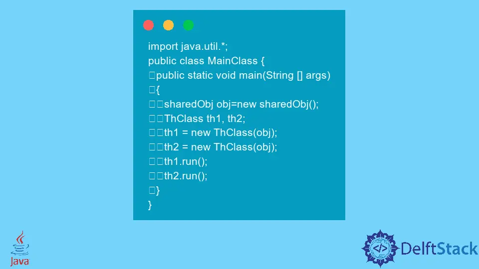 sharedObj.java: We have declared a volatile shared variable shared among threads in this class.ThClass.java: This class is used to create threads. It extends theThreadclass and overrides therun()method. Each thread sleeps for a 1-second duration.MainClass.java:Mainclass is the most important class implementing themain()method from where the execution starts. We have created two threads and passed a shared object as a parameter through the constructor.