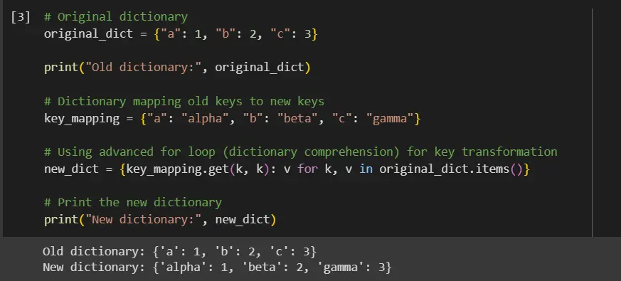 We then employ dictionary comprehension, a compact and advanced form of a for loop, to iterate over original_dict. During each iteration, we use key_mapping.get(k, k) to fetch the new key for each original key k, defaulting to k if it isn’t found in key_mapping.