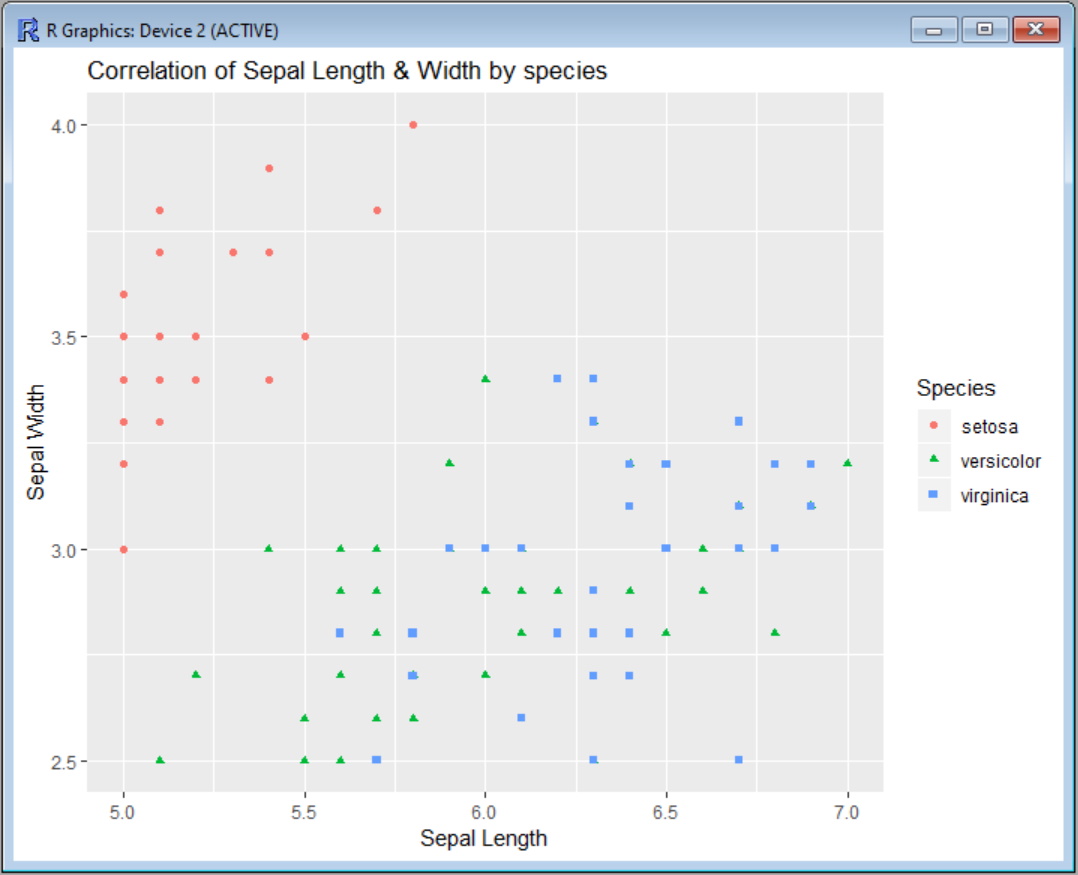 Let’s first see our scatter plot without putting any limit to the axis. In this example, we use the Iris data set to correlate the sepal width values and sepal width, categorizing the species by color. Before calling the ggplot function, we need to install the ggplot2 package and load the corresponding library: