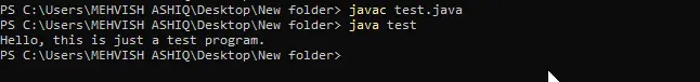 今回は、javac test.javaを使用してコードをコンパイルしました。 コンパイルが成功したら、java test コマンドを使用してプログラムを実行します (独自のファイル名を書くことを忘れないでください)。