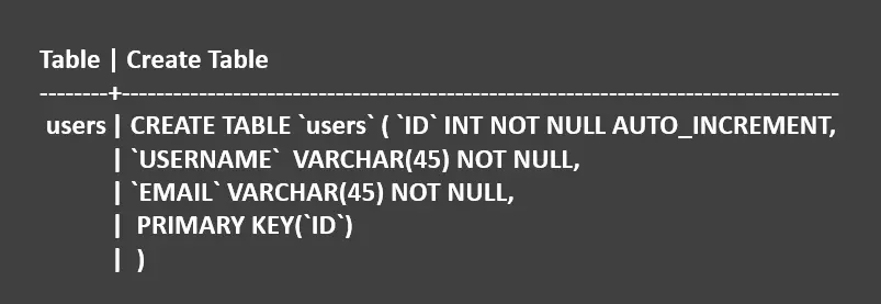 SHOW CREATE TABLE test.users; を使用します。 主キーが USERNAME であることを確認します。