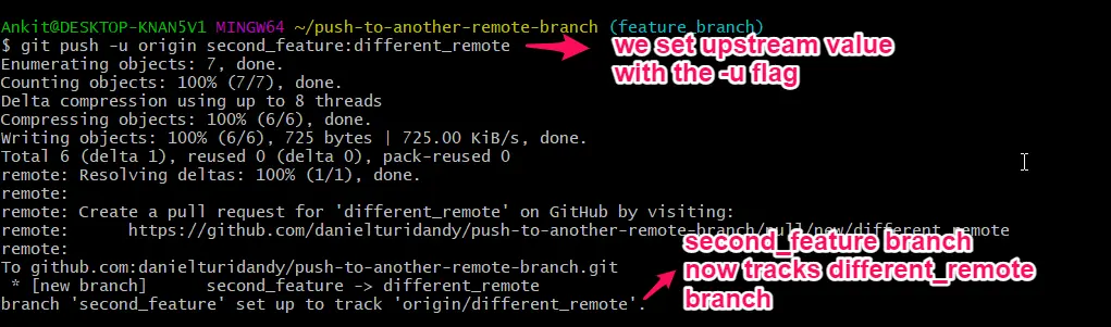 如果你現在推送 second_feature 而不提及 dst 引數,Git 會自動將其推送到 different_remote。