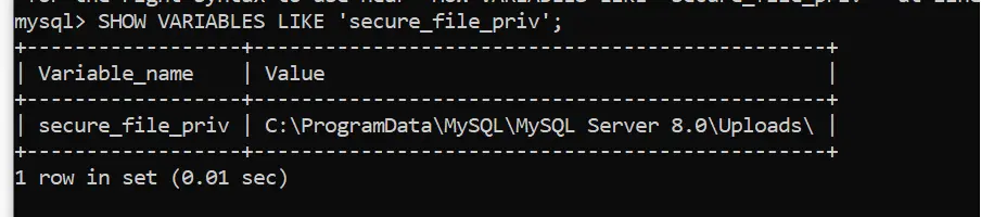 可以使用以下命令檢視為變數 --secure-file-priv 設定的當前路徑:
