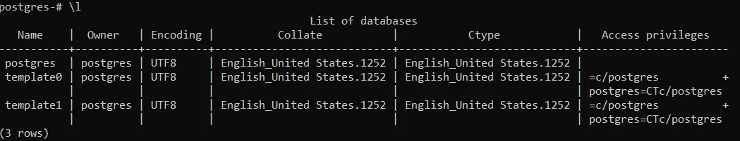 你現在將在你的 PostgreSQL 伺服器中。要檢視所有資料庫,請寫出以下命令: