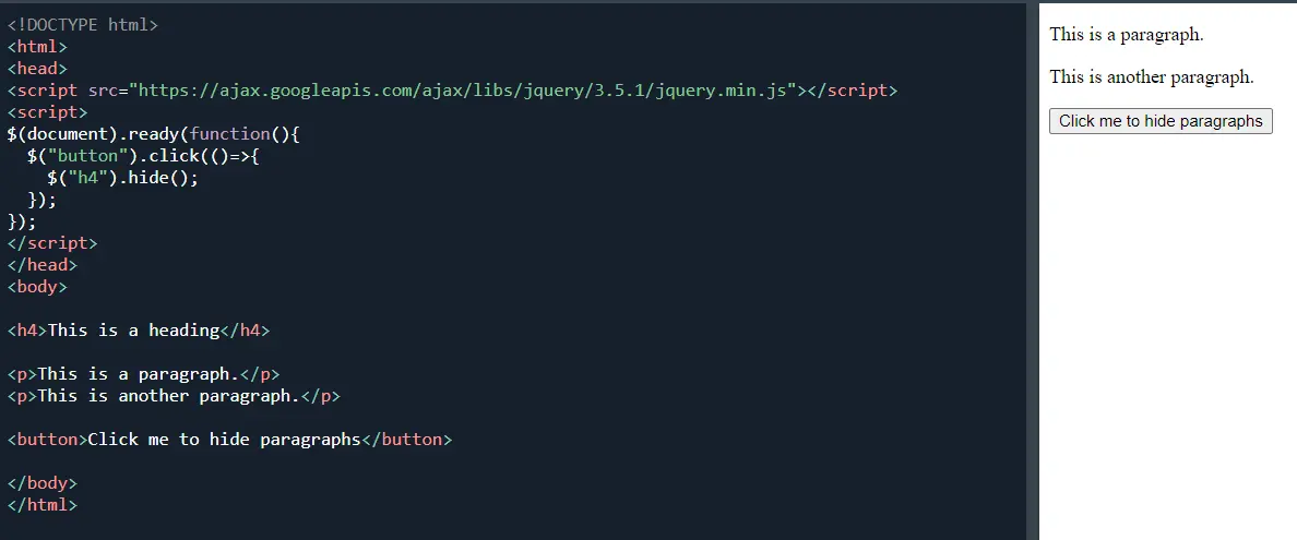 上面的代码选择了 document 对象,并且在 ready 状态下,它会触发一个事件,在该事件中它选择了一个 button 和 on click 动作,该动作隐藏了 h4 标记的标题。HTML 结构在初始阶段看起来像这样。